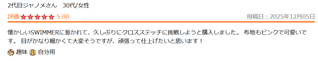 現在、楽天で発売中の「かえるのピクルス」「SWIMMER」クロスステッチキットです。
