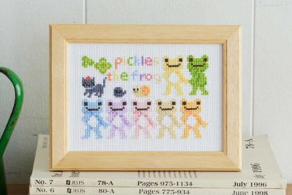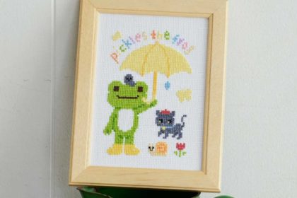 現在、楽天で発売中の「かえるのピクルス」クロスステッチキットです。